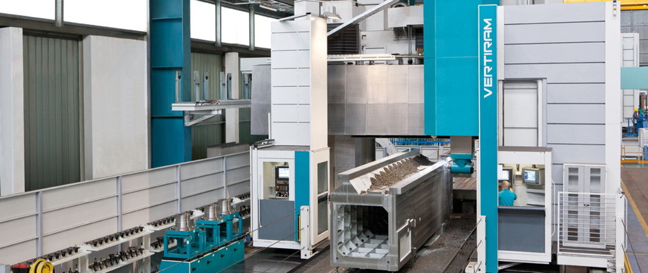●Vertiram加工中心系列由五種基本機(jī)型組成,立柱間距從4600mm到6600mm,主軸端面到工作臺(tái)面最大間距從4000mm到5000mm,X軸龍門移動(dòng)最小行程為6000mm,Z軸滑枕行程為2000mm,W軸橫梁行程從2600mm到3600mm